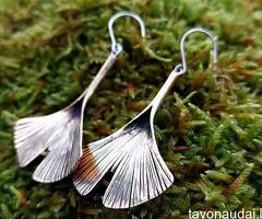 Rankų darbo, nukalti (nelieti), vienetiniai auskarai, vaizduojantys ginkmedžio lapelius.